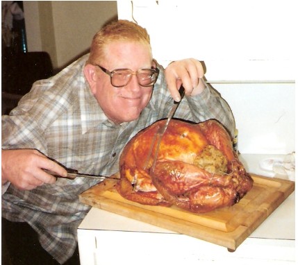 When it came time to celebrate Christmas, dad could always be counted on to get into the mood. We probably have a dozen pictures just like this one, dad smirking with his “silly face”, hunched over another gorgeous turkey, protecting it from grabby fingers that might sneak the delicatable scraps.
